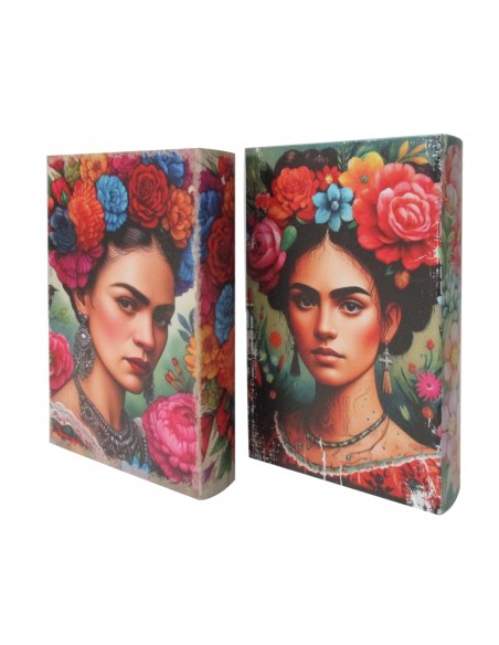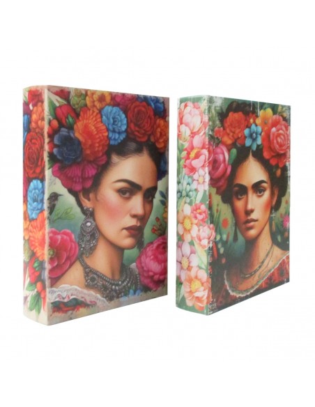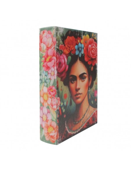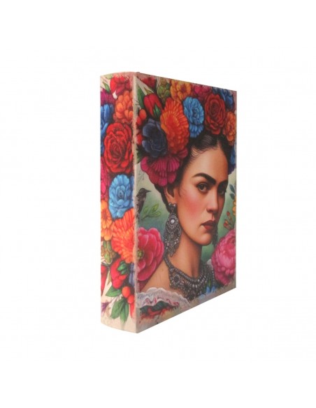 Bonita caja con forma de libro decorada con la imagen de Frida Kahlo rodeada de flores de vivos colores.