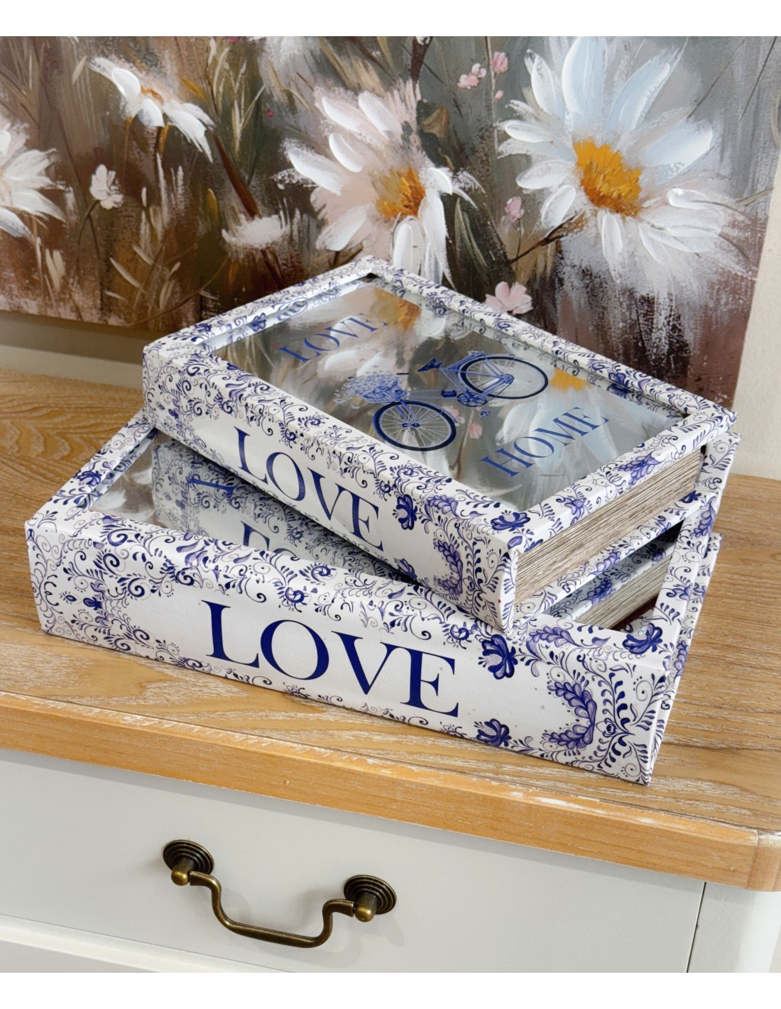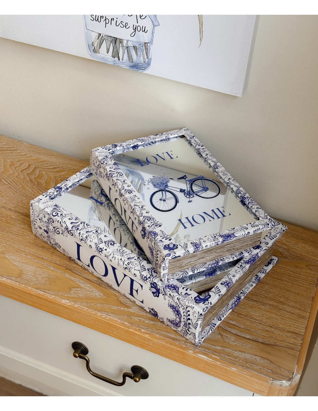 Original caja con forma de libro, decorada con un encantador diseño en tonos azul y blanco con bicicleta y la frase Love Home. En la tapa incorpora un espejo.