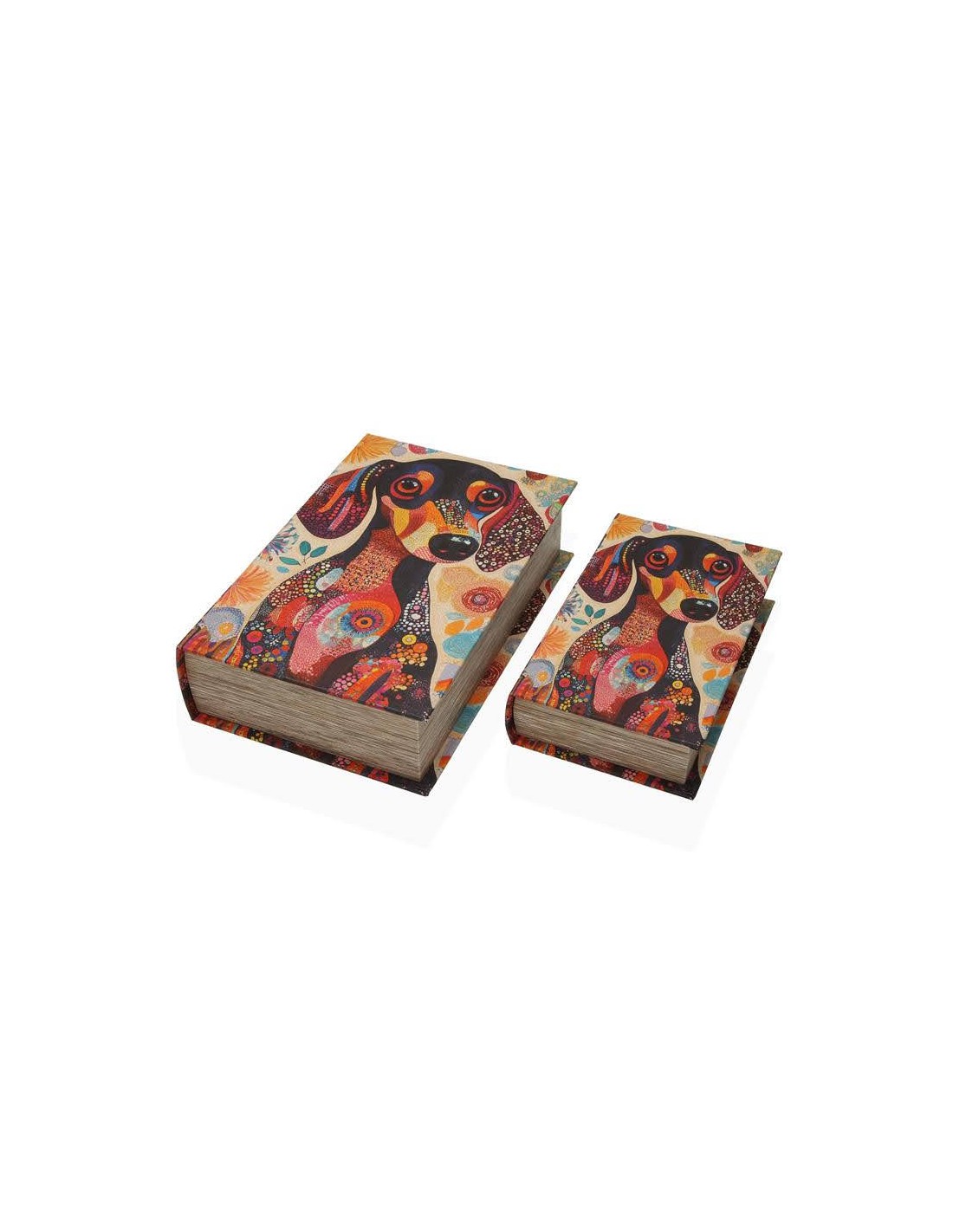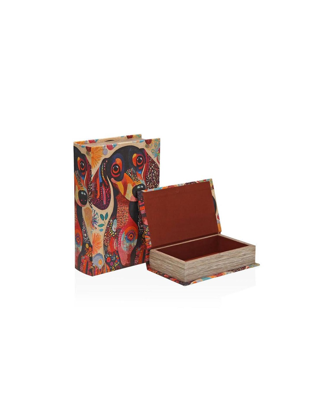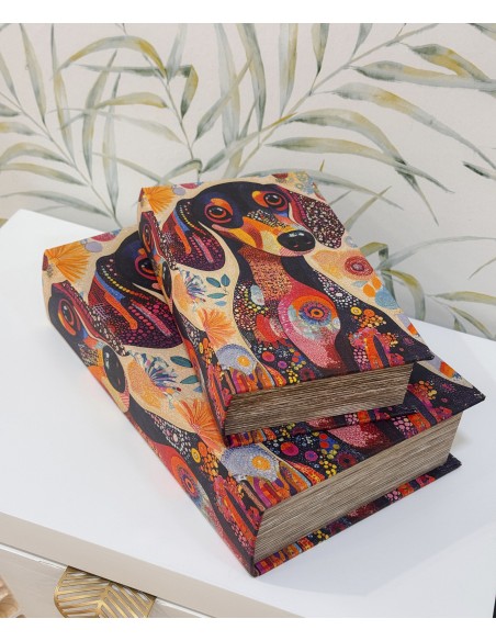 Divertida caja con forma de libro, decorada con una ilustración vibrante de perro salchicha en tonos multicolor.