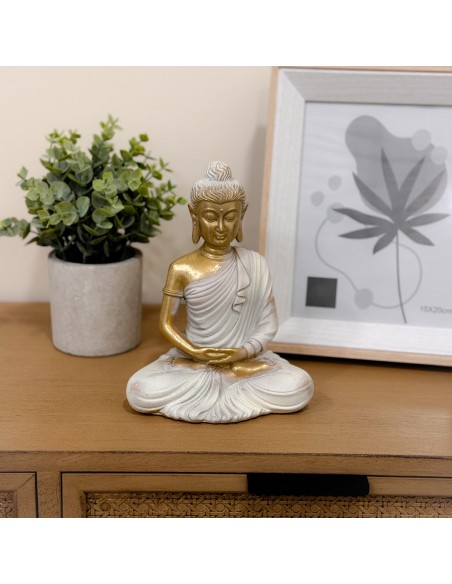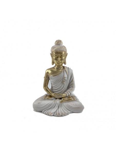 Figura decorativa en forma de buda fabricada en resina en color dorado y efecto decapado blanco.