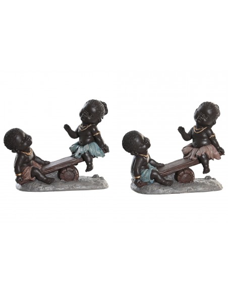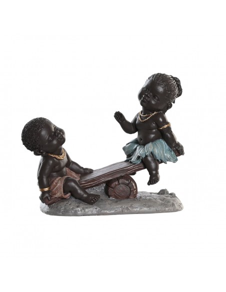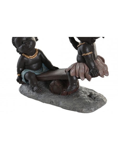 Representa un niño y una niña africana sonriendo jugando al balancín.