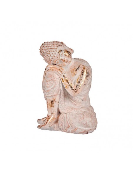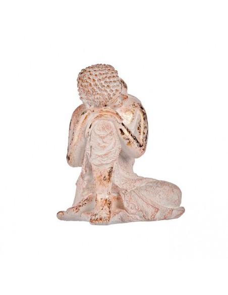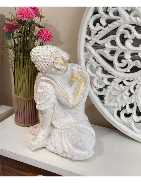 Original figura decorativa de Buda en poliresina, en posición sentada con la cabeza apoyada sobre las rodillas.
