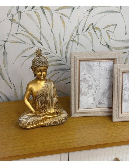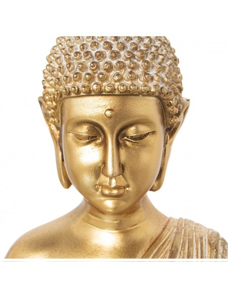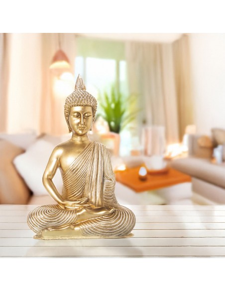 Figura decorativa de Buda en posición de meditación fabricada en resina con un elegante acabado dorado.