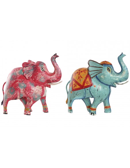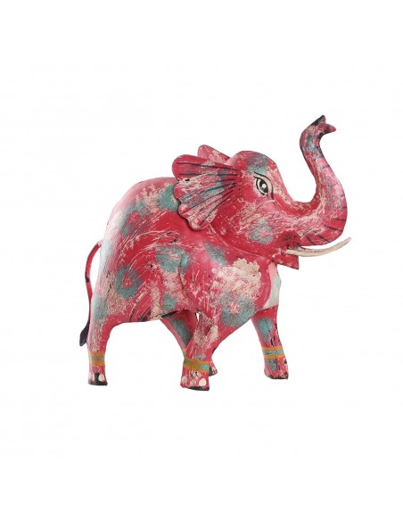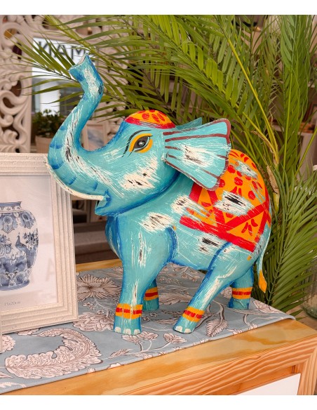 Figura decorativa de elefante en metal pintada a mano con colores vivos y un acabado envejecido que la hace única. Su diseño artesanal y sus detalles llenos de personalidad aportan un toque exótico y alegre a cualquier rincón de tu casa.
