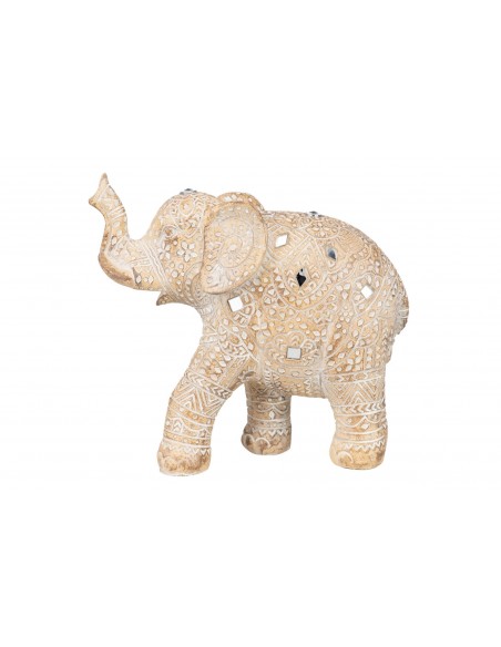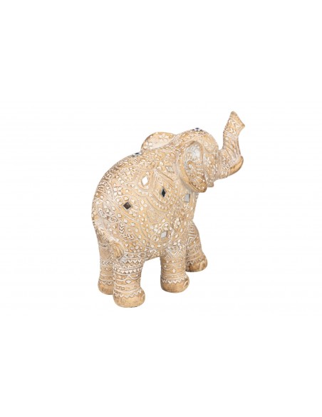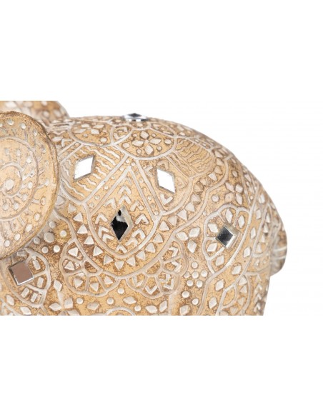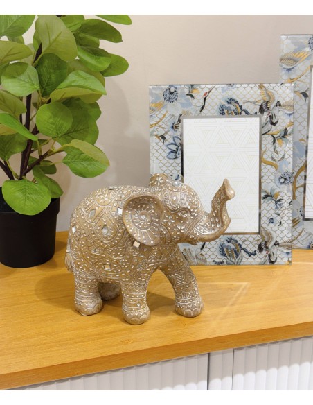 Esta figura de elefante en tonos beige, con grabados étnicos y detalles de espejos, transmite elegancia y buenas vibras.