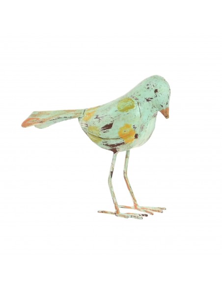 Figura decorativa de pájaro en metal pintado con acabado envejecido en tonos turquesa, naranja y mostaza.