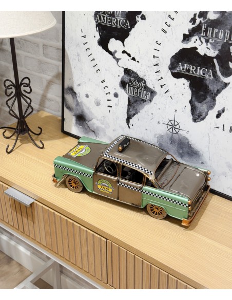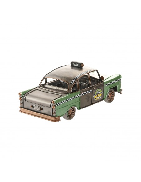 Divertida figura decorativa de metal con forma de taxi clásico en tonos verde, negro y detalles en cobre envejecido.