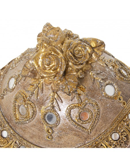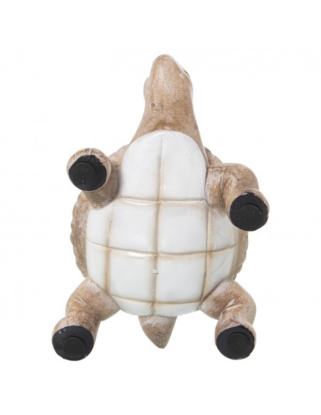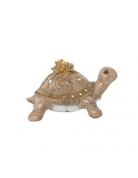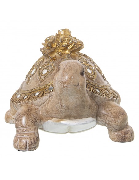 Figura decorativa fabricada en resina con forma de simpática tortuga de color marrón con detalles dorados y pequeños espejos con los que destacará allá donde la coloques.