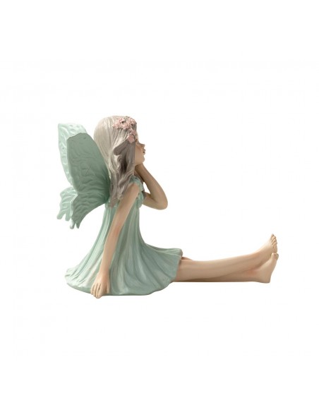 Representa una linda hada sentada pensativa con un largo pelo y alas desplegadas en un bonito verde agua a juego con su vestido.