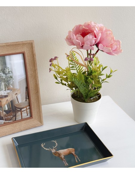 Bonita planta artificial de una peonia rosa con hojas verdes en maceta de PVC de color blanco, ideal para decorar cualquier rincón de tu hogar.