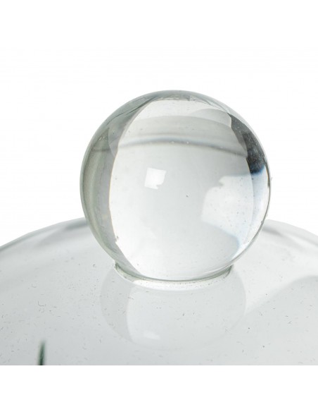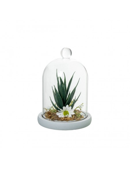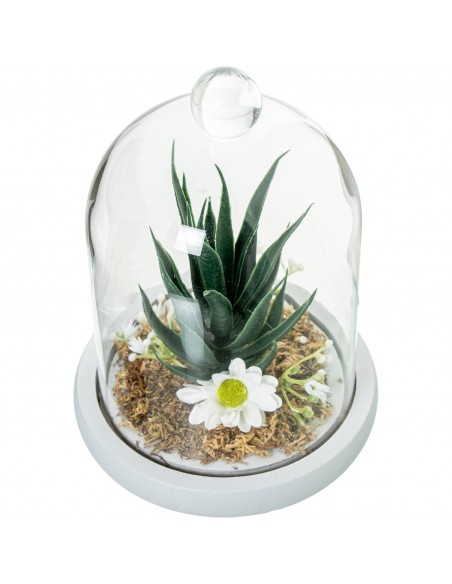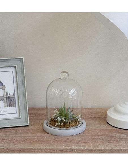 Elegante cúpula de cristal con base de madera que resguarda una suculenta artificial acompañada de delicadas flores y musgo.