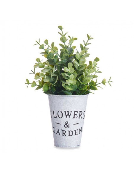 Muy decorativa, viene presentada en un macetero alto de metal gris decorado con un letrero en negro que dice ¨Flowers & garden¨.