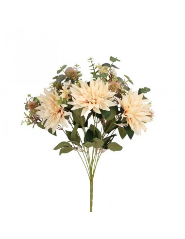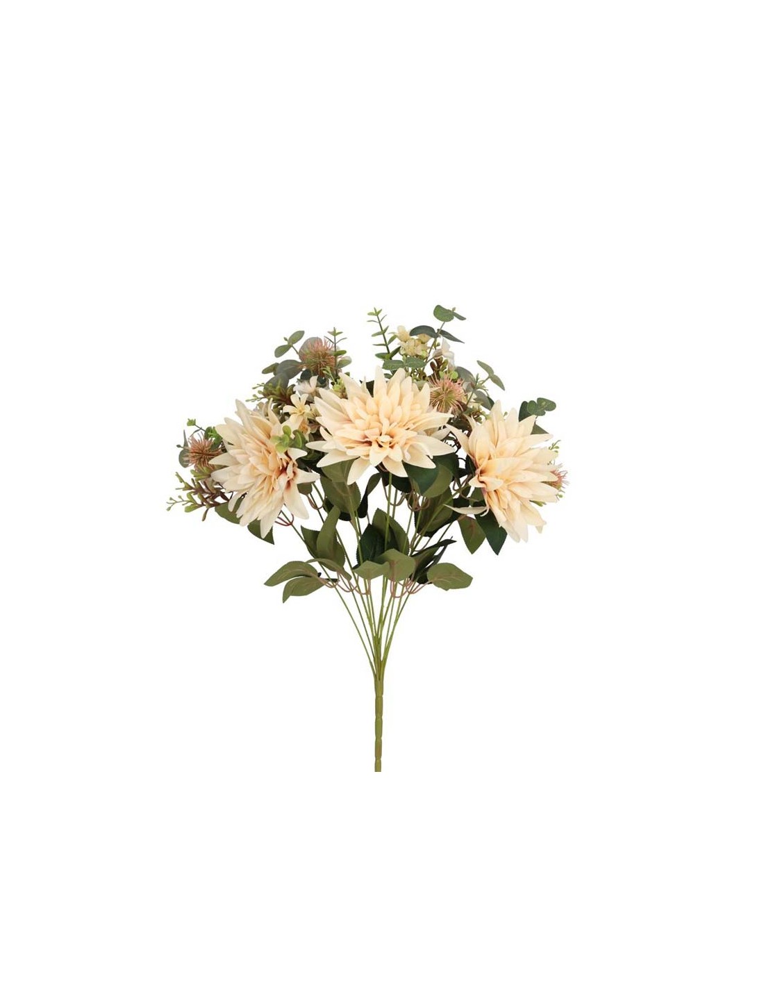 Ramo encarado de dalias con hojas y flores silvestres en su parte posterior, creando una composición natural, equilibrada y con mucho movimiento.