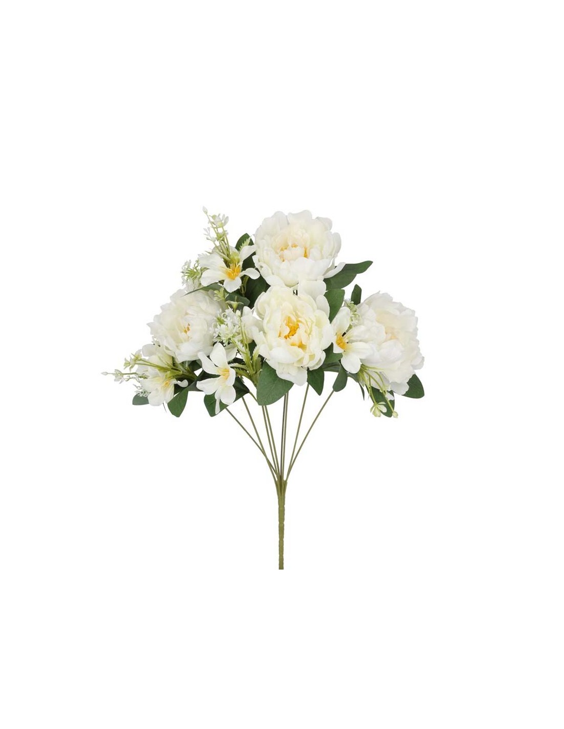 Ramo de peonías abiertas combinadas con lirios y hojas verdes en su parte posterior.