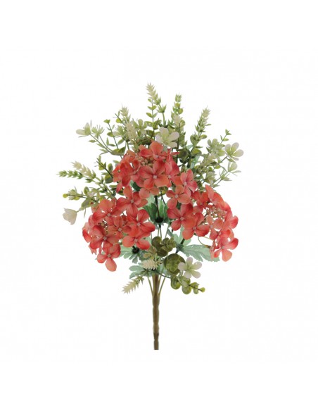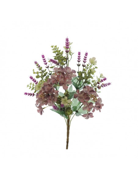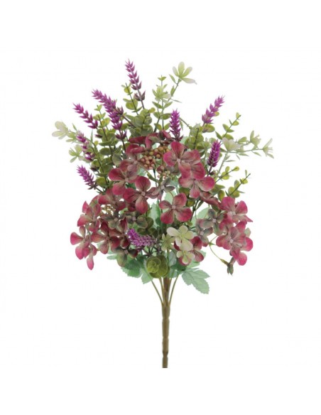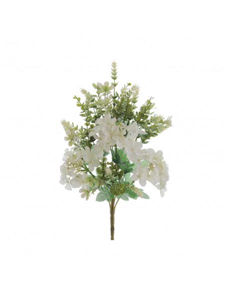 Precioso ramo compuesto por flores de hortensias, además está decorado con hojas verdes silvestres.