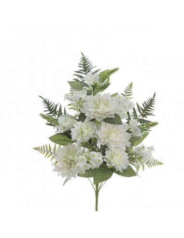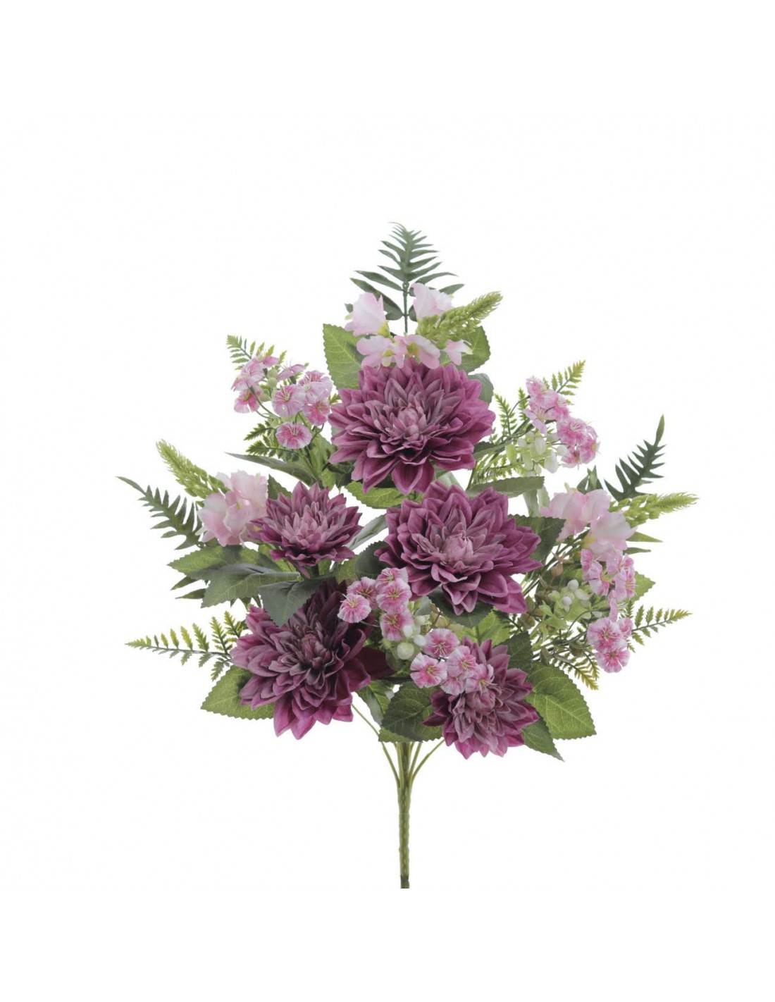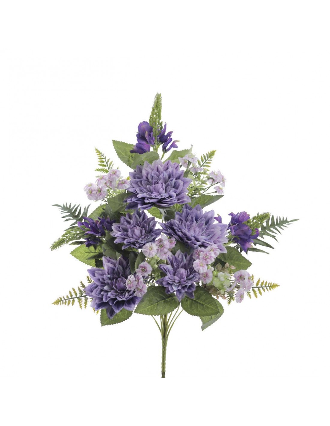 Ramo de dalias con gran volumen, detalles de pequeñas flores silvestres y hojas verdes que aportan frescura y contraste.