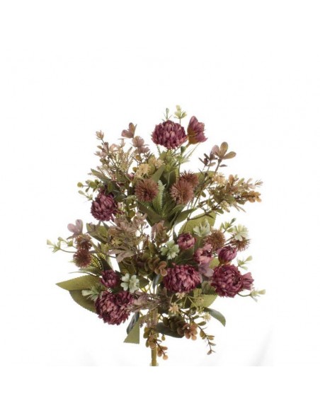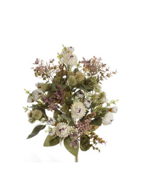 Ramo encarado de flores tipo pompón acompañado de hojas silvestres y detalles vegetales en tonos suaves y naturales.