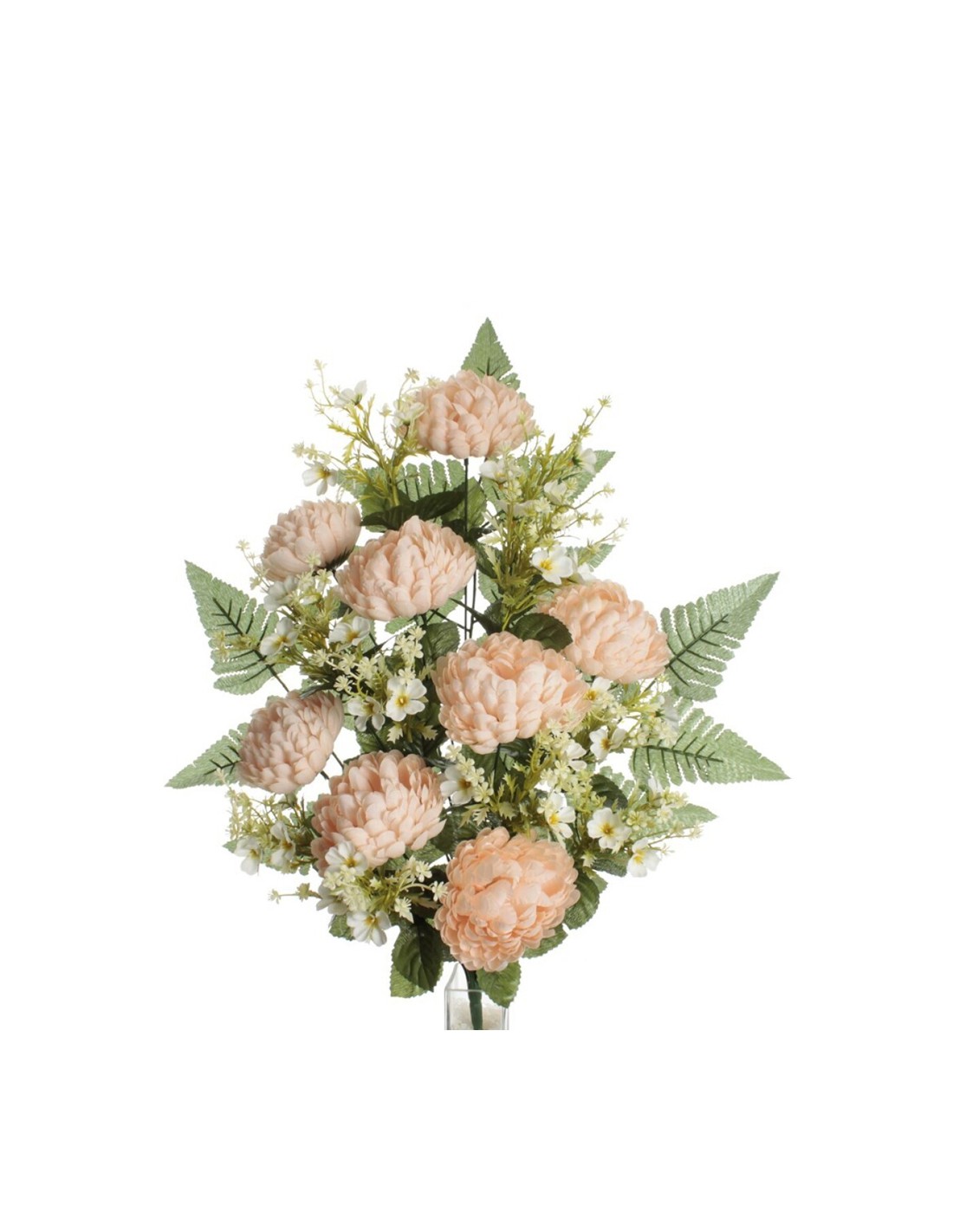 Ramo encarado de crisantemos acompañados de pequeñas flores silvestres y hojas de helecho, todo dispuesto en una composición equilibrada que transmite frescura y dulzura.