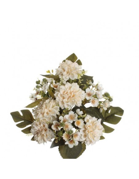 Ramo encarado con dalias abiertas de pétalos suaves, acompañadas de flores silvestres y un follaje verde con hojas tipo monstera que aportan un aire fresco y tropical a la composición.