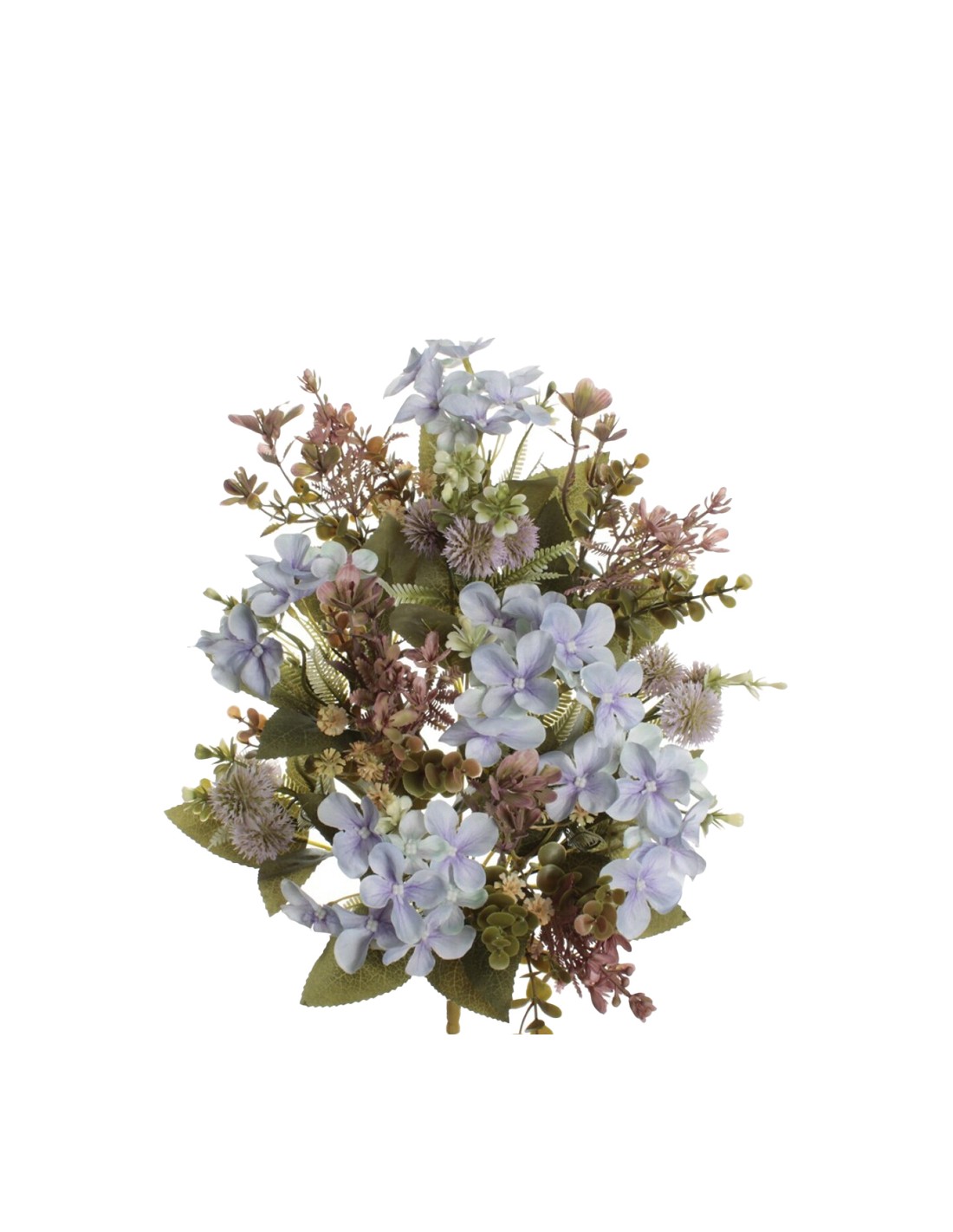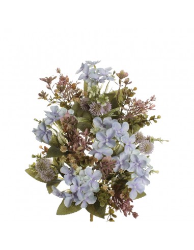 Ramo decorativo de mini hortensias artificiales acompañado de hojas silvestres y pequeños detalles florales que aportan un aire fresco y delicado a cualquier ambiente.