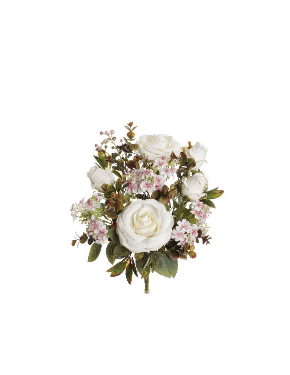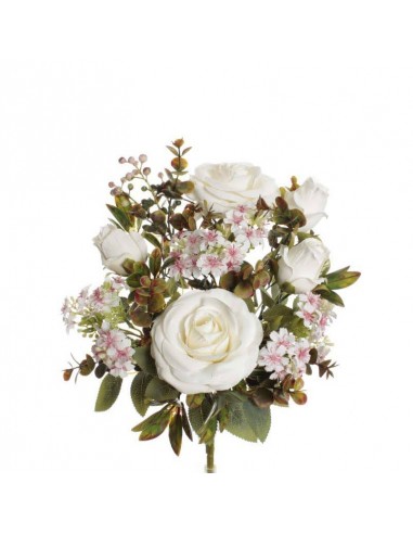 Ramo encarado de rosas abiertas y capullos combinados con pequeñas flores silvestres y hojitas verdes que llenan la composición de frescura y suavidad.