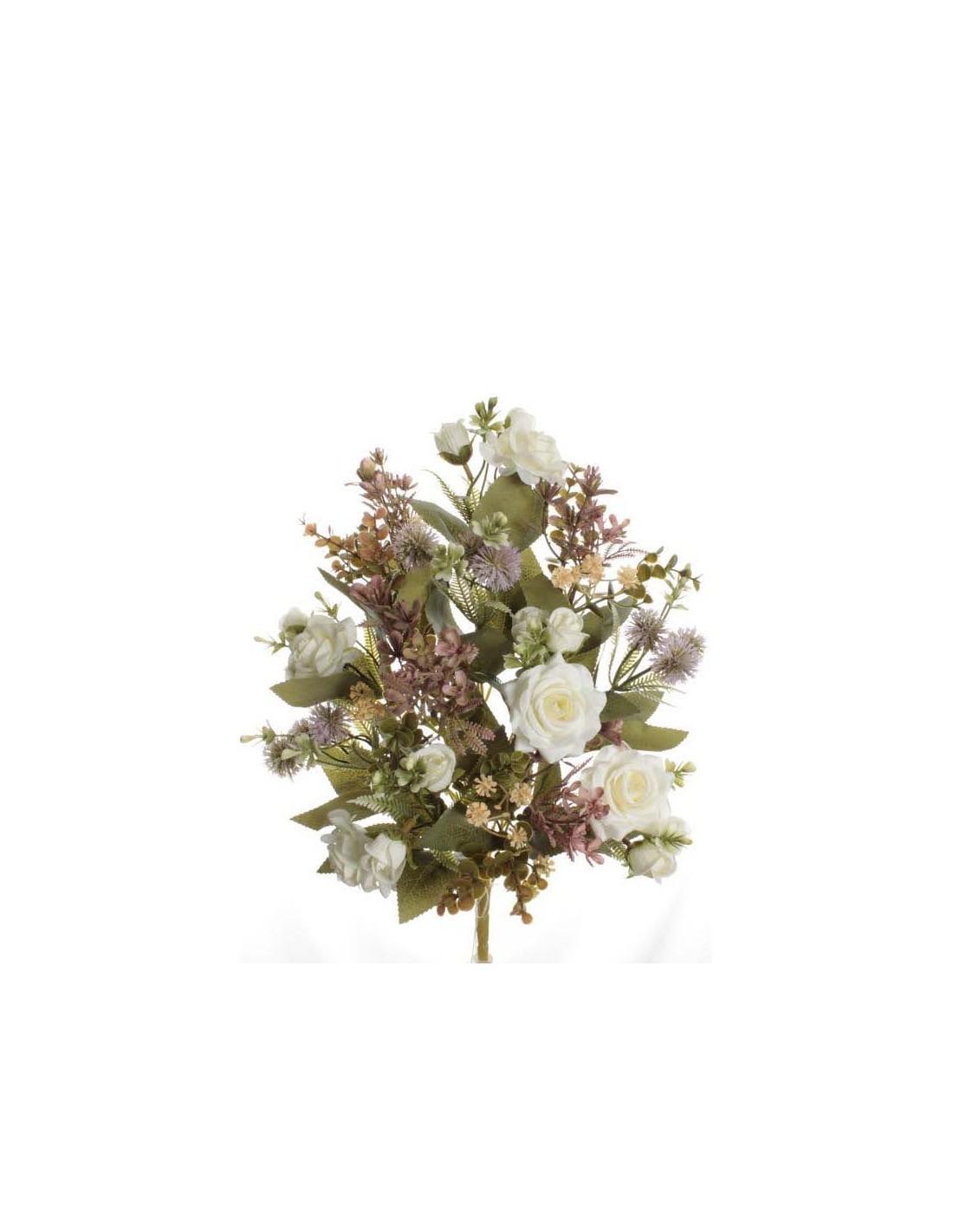Ramo encarado de pequeñas rosas blancas acompañado de flores silvestres en tonos lavanda, rosa viejo y crema.