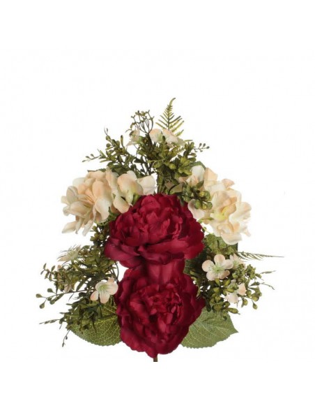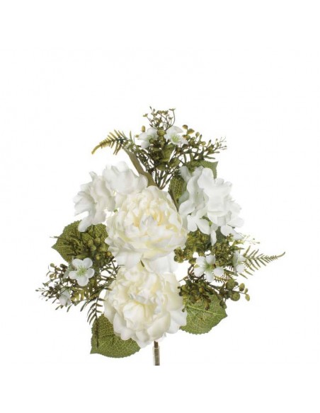 Ramo encarado de peonías abiertas combinadas con hortensias y hojitas decorativas que le aportan volumen y un aire silvestre encantador.