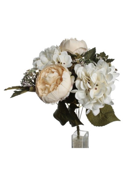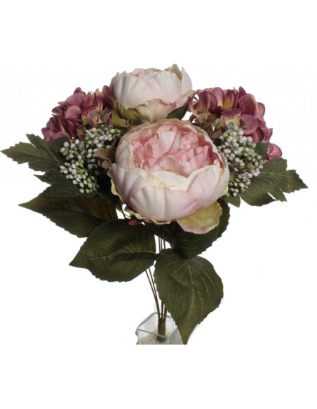 Precioso ramo compuesto por peonías y hortensias, además está decorado con hojas verdes silvestres.