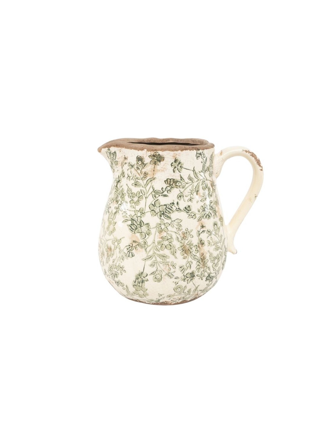 Encantadora jarra de cerámica con acabado envejecido y delicado estampado floral en tonos suaves.