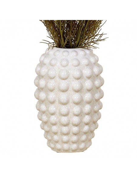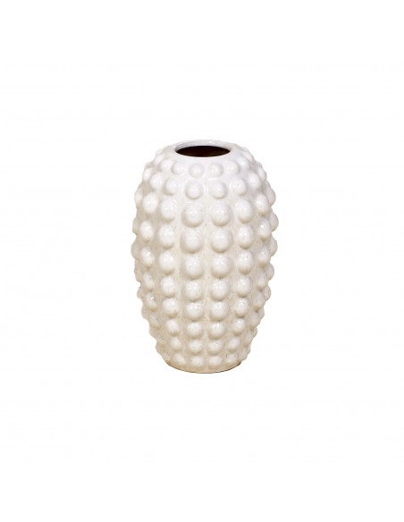 Original y moderno jarrón florero de color blanco, con un diseño en relieve de bolas que sobresalen. Las líneas curvas son tendencia esta temporada, añáde accesorios como este para renovar tu hogar de forma rápida con un toque muy chic. Ponlo en cualquier mueble o estantería vacía ya que decora por sí solo o añádele unas flores.