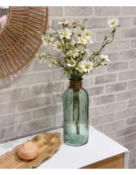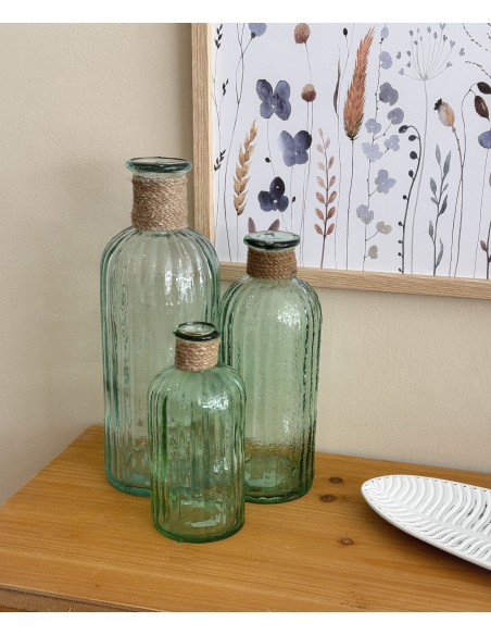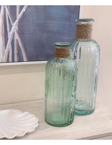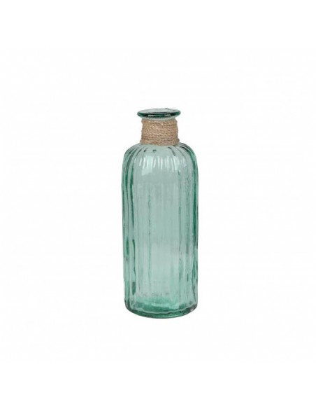 Bonita botella de cristal 100% reciclado fabricada en España estilo vintage tiene 1.5L de capacidad, su boca estrecha está decorada con cuerda de yute.