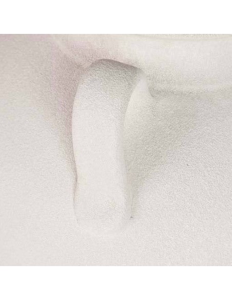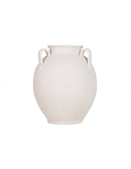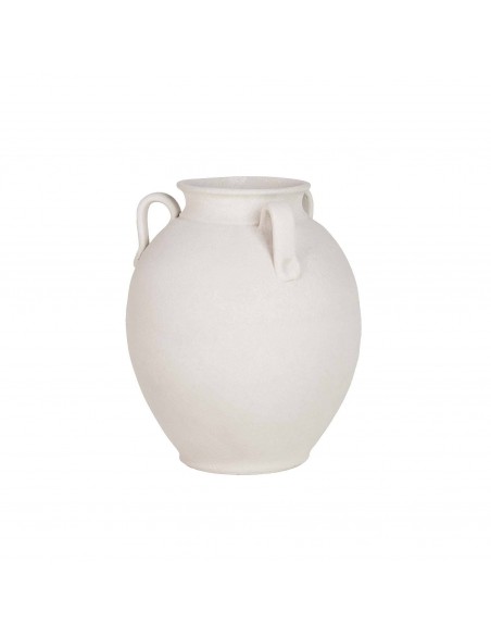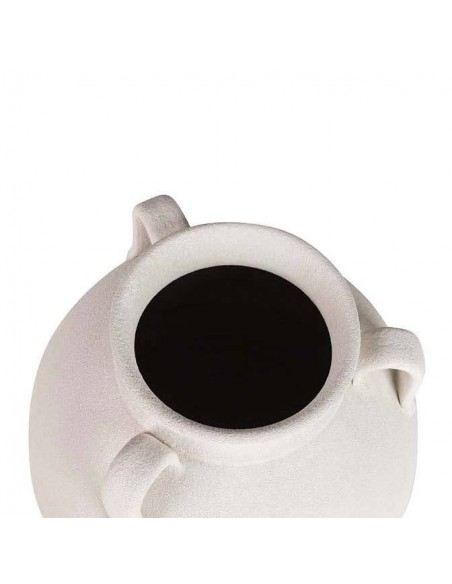 Con un diseño elegante y atemporal, este jarrón de cerámica en tono blanco destaca por su acabado rugoso y sus asas decorativas, que le dan un aire artesanal y mediterráneo.