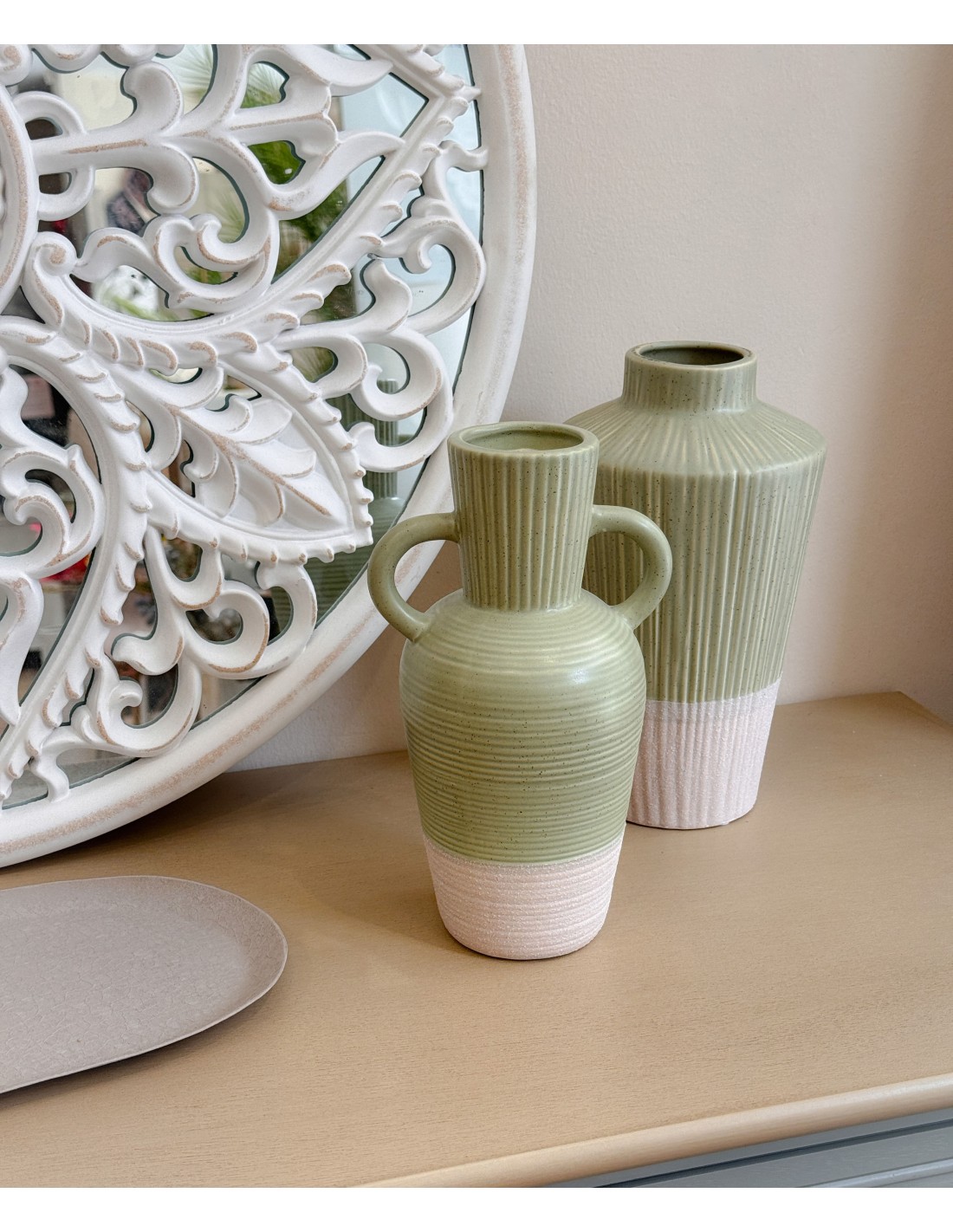 Su diseño de inspiración mediterránea con doble asa y formas redondeadas lo convierte en una pieza elegante y con personalidad.