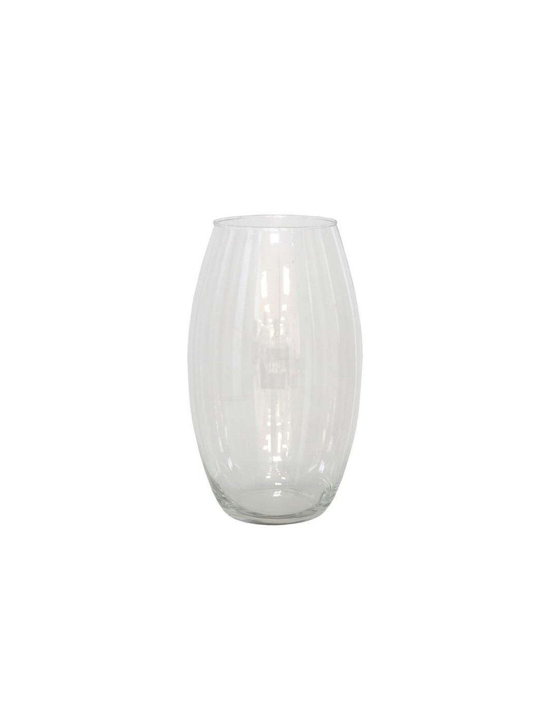 Jarrón de cristal con forma ovalada y delicado relieve de líneas verticales que aportan elegancia y un sutil efecto visual.