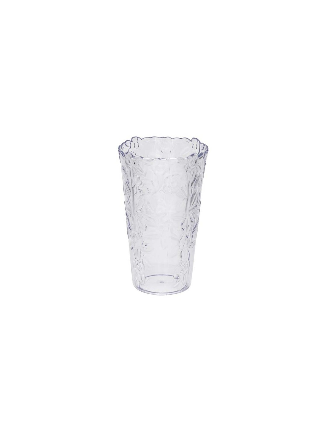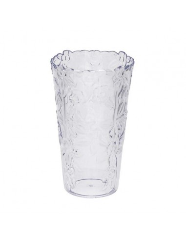 Original jarrón de pvc transparente con relieve floral y borde ondulado que aporta un aire romántico y decorativo.