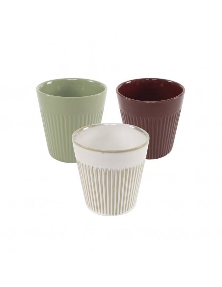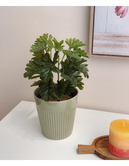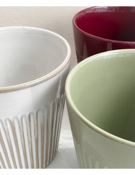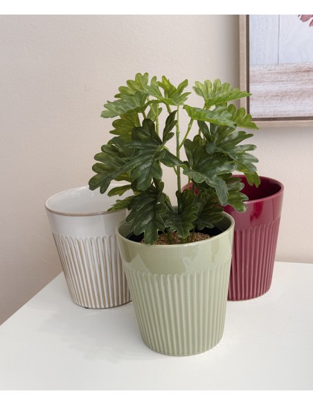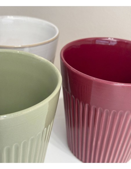 Macetero de cerámica con relieve vertical, disponible en tres colores con acabado brillante o satinado según el modelo. Su forma cónica y textura estriada lo convierten en una pieza actual y decorativa.