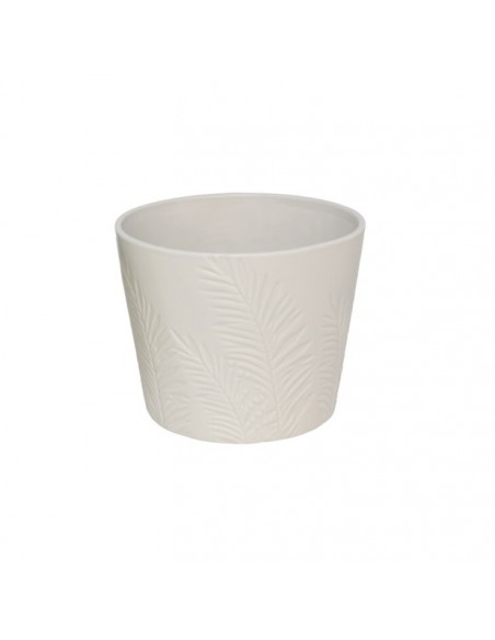 Preciso macetero redondo fabricado en cerámica dolomita de color blanco con un diseño en relive de hojas tropicales que le da un toque diferente.