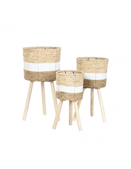 Decorativo macetero con pie, elaborado en fibra trenzada en tonos beige y blanco, con estructura firme y patas de madera clara.