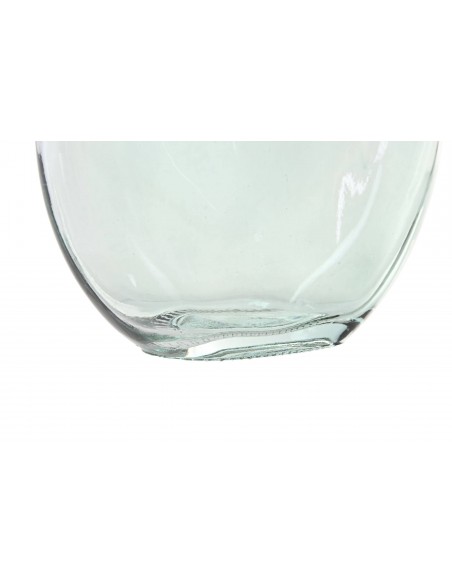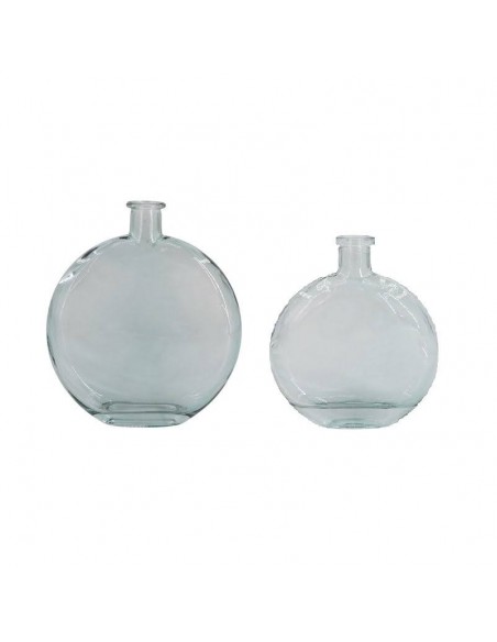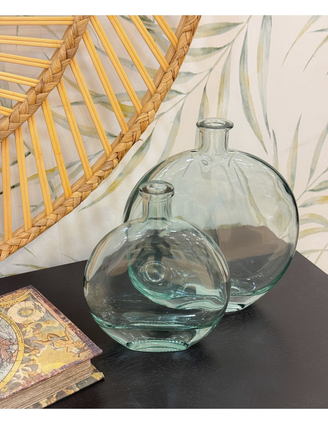 Set de dos jarrones redondos de cristal reciclado con acabado transparente ligeramente verdoso y forma plana, delicada y decorativa.
