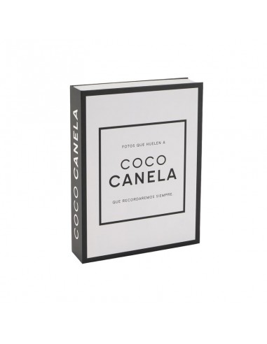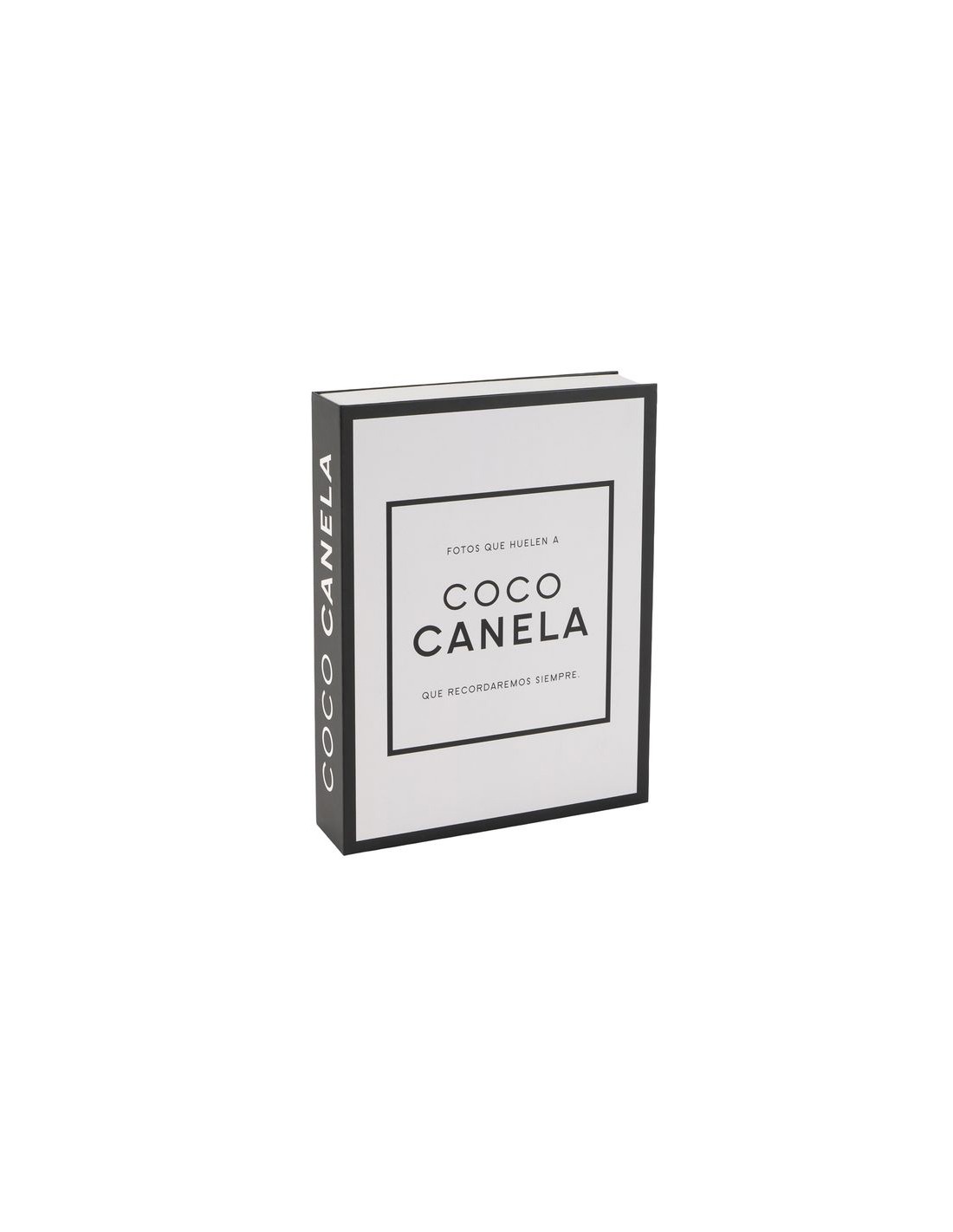 Álbum tipo libro con diseño elegante en blanco y negro y la frase “Fotos que huelen a coco canela, que recordaremos siempre”.
