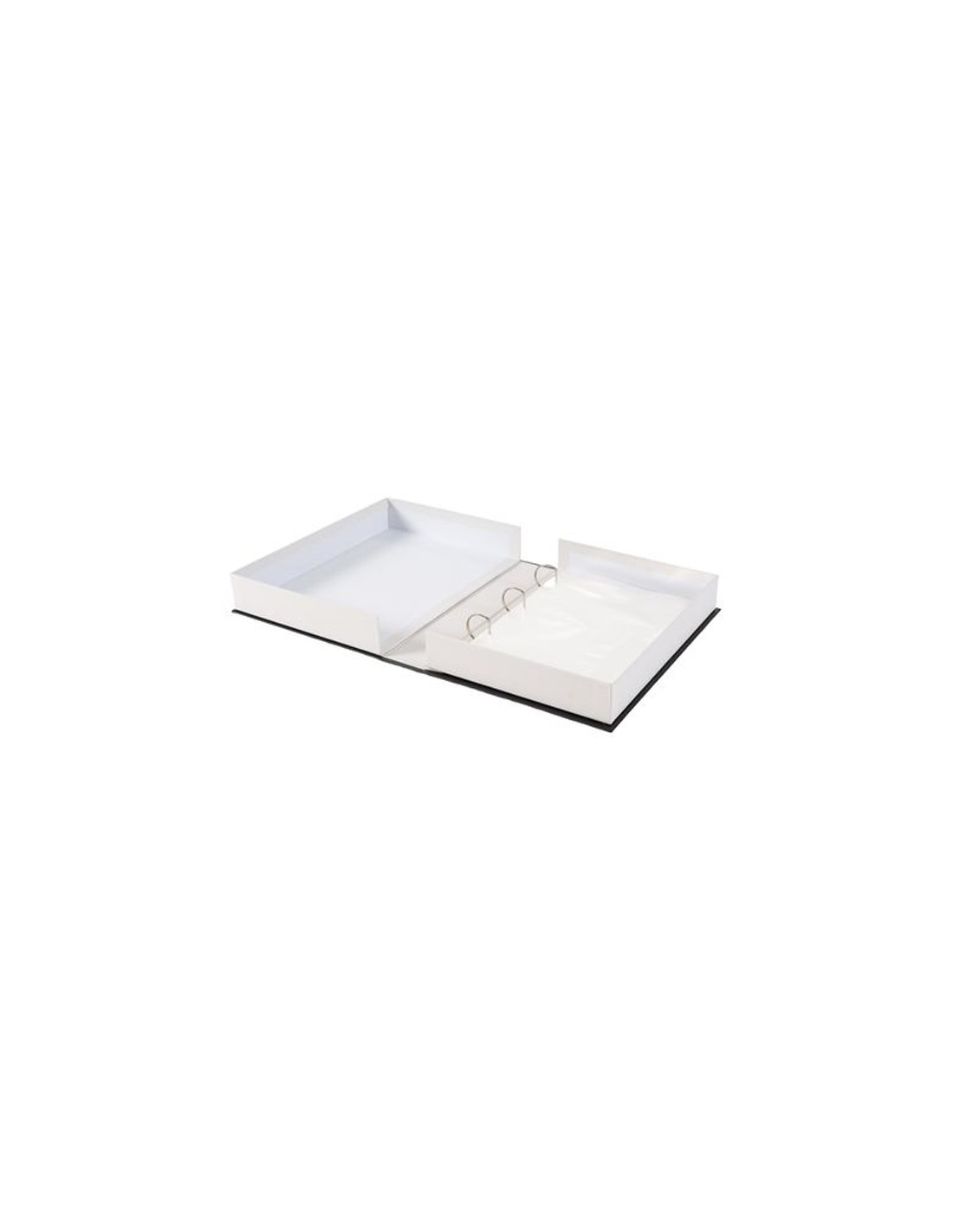 Al abrirlo, se convierte en una práctica caja archivadora con anillas y fundas plásticas para guardar hasta 60 fotos de 10x15 cm.