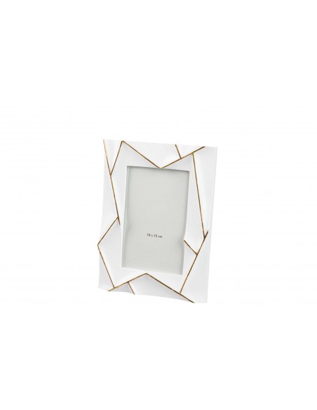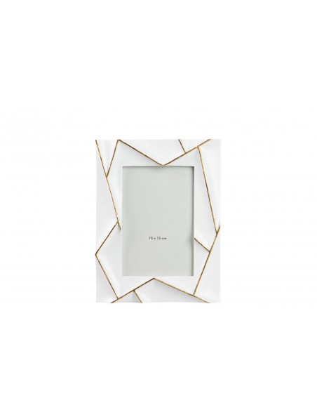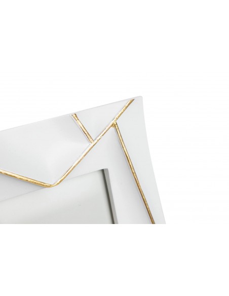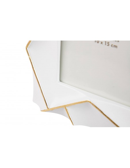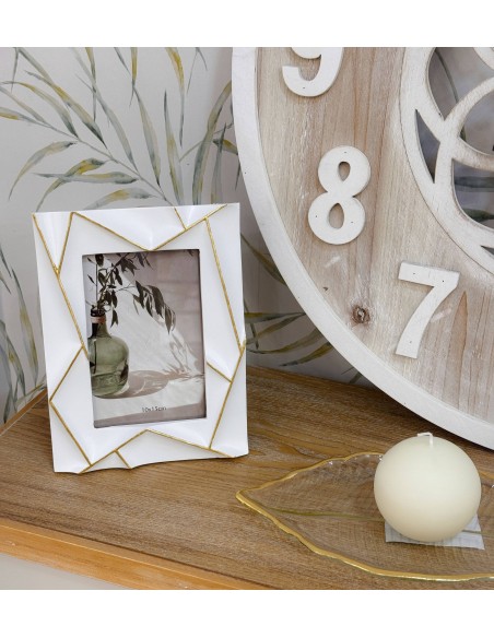 Dale un toque moderno a tus recuerdos con este portafotos de resina blanca y detalles dorados.