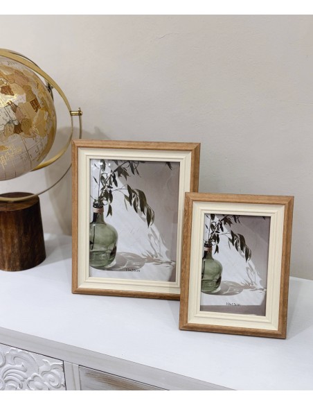 Conserva tus mejores recuerdos con este elegante portafotos de madera en tonos claros y naturales. Su diseño bicolor aporta calidez y un toque rústico a cualquier espacio.