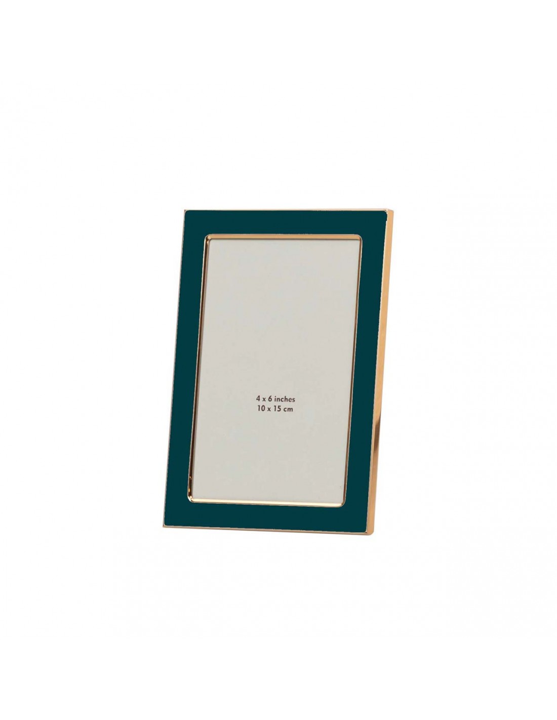 Elegante portafotos con marco metálico en acabado dorado y frontal esmaltado en azul verdoso que aporta profundidad y sofisticación.