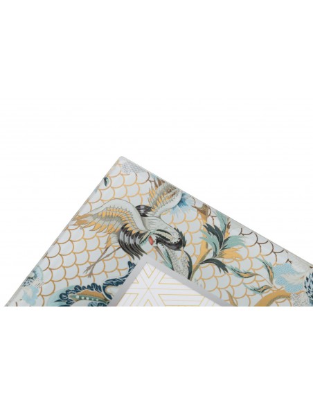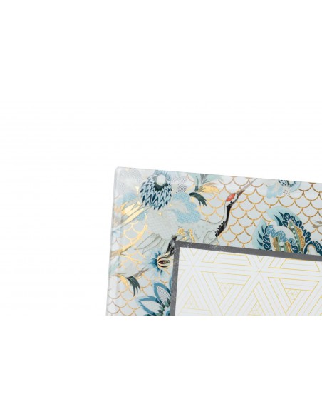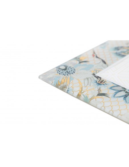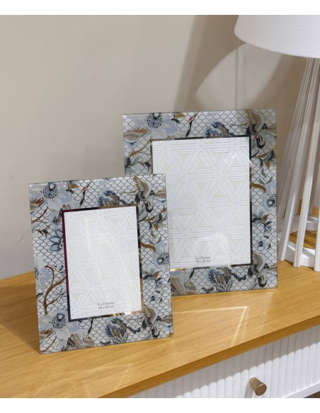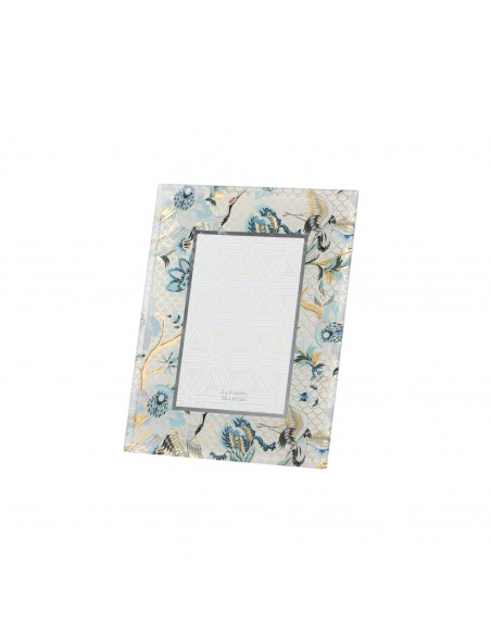 Un marco de fotos que parece una joya. Su marco de cristal decorado con flores, aves y detalles dorados sobre fondo azul pastel aporta un aire romántico y sofisticado.