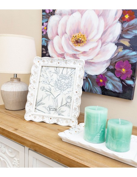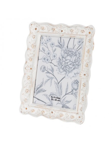Marco de foto fabicado en resina de color blanco con efecto envejecido y flores en relieve que le aportan un aire muy romántico.