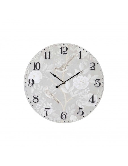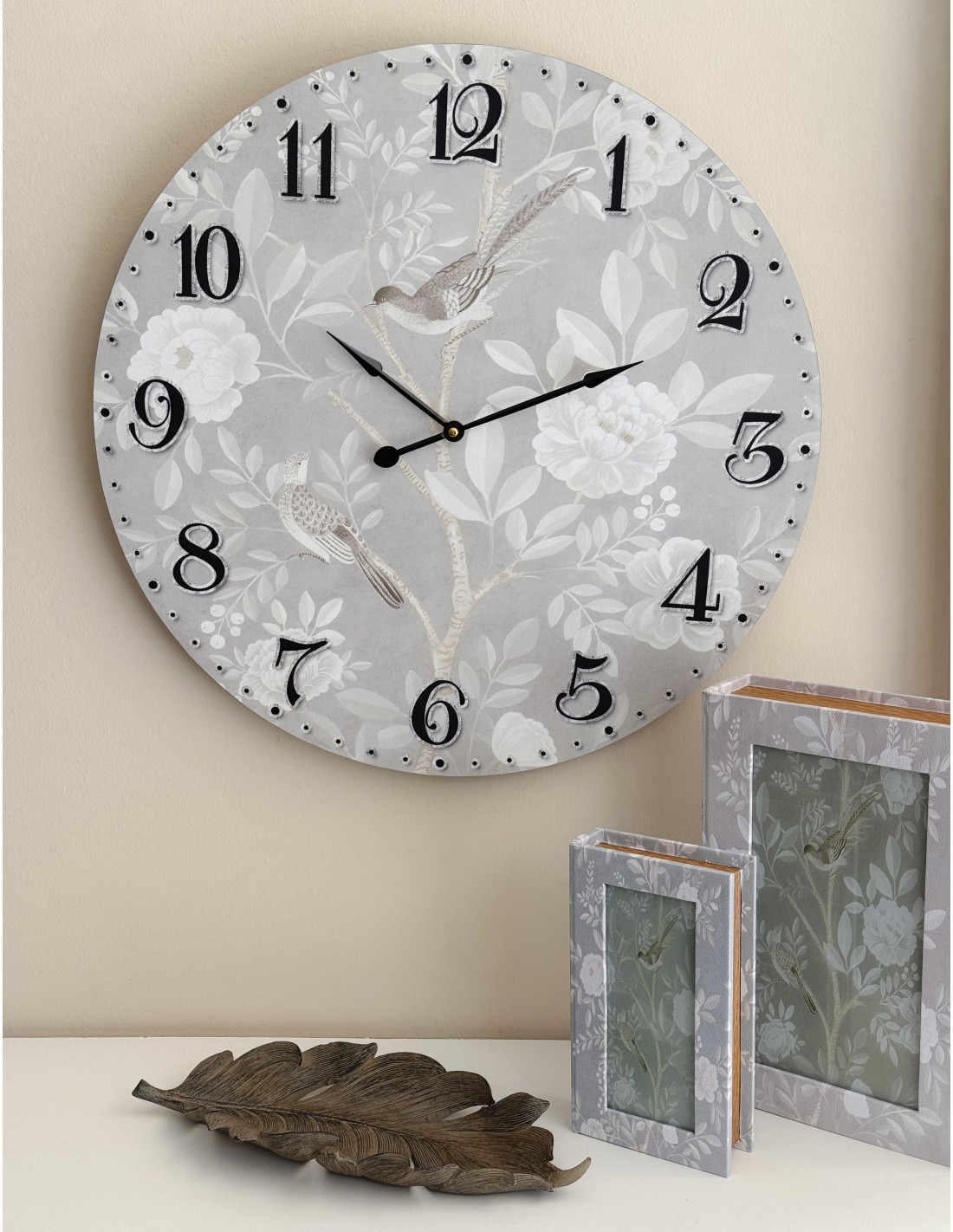 Original reloj de pared con diseño floral en tonos suaves, acompañado de pájaros decorativos que le dan un aire elegante y acogedor.