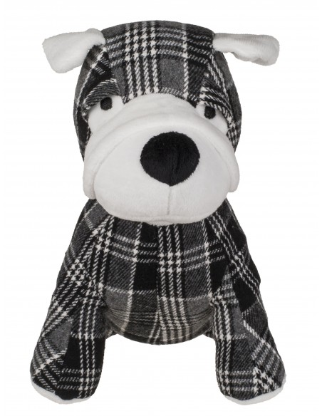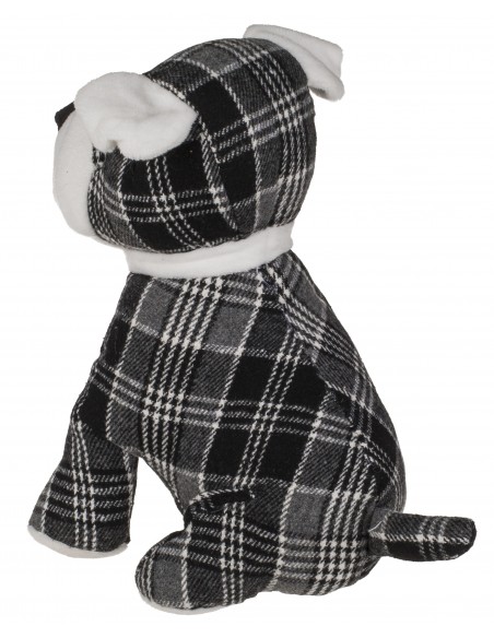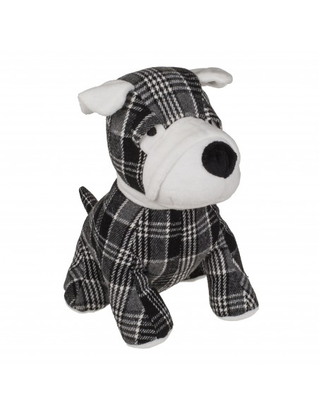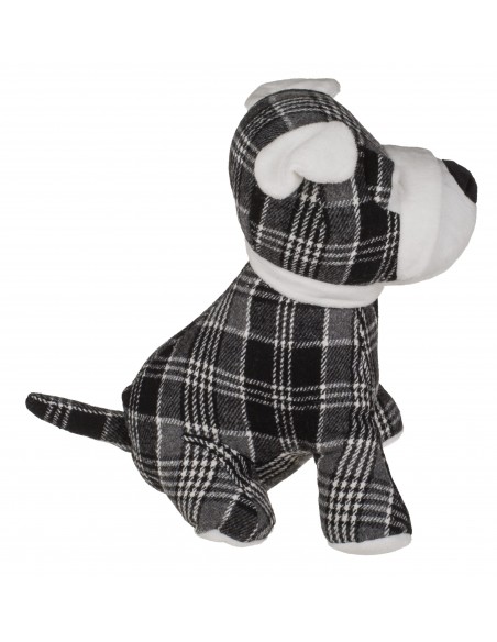 Precioso y original sujetapuertas confeccionado en tela de poliéster con un estampado a cuadros de color blanco y negro, se caracteriza por tener forma de perro sentado súper tierno.
