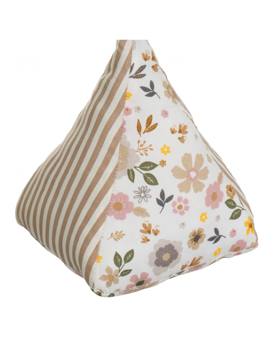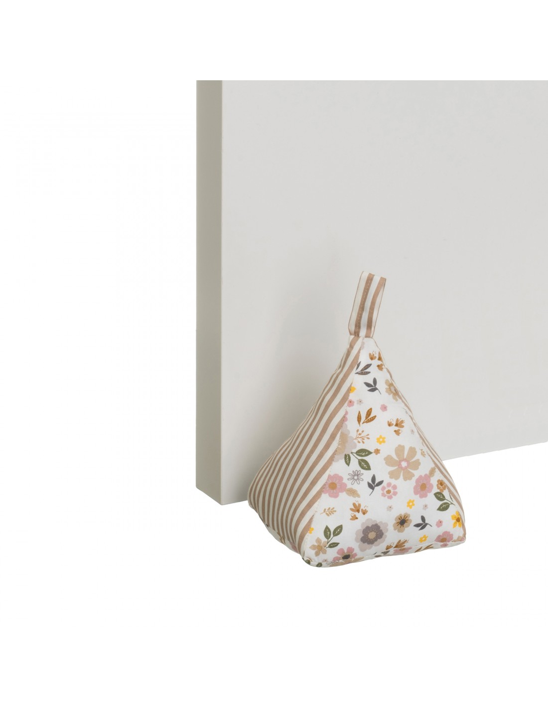 Bonito tope de puerta en forma triangular, elaborado en tela con un delicado estampado floral combinado con rayas beige.