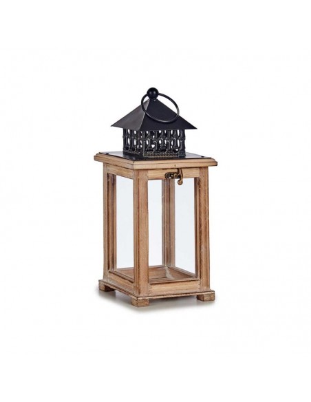 Original farol decorativo de madera en tono natural con tapa metálica negra.